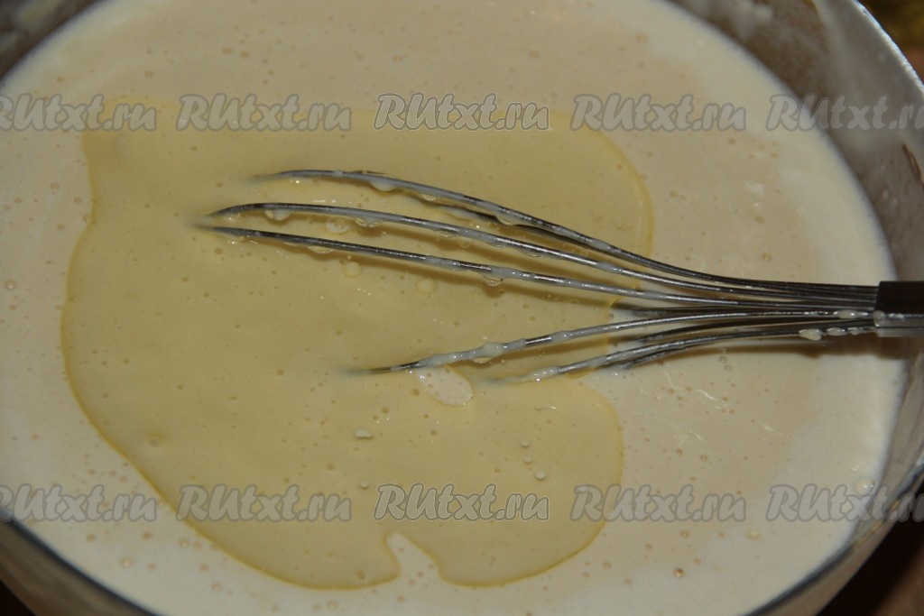 Перемешать блинное тесто венчиком, оно будет не густым, затем влить растительное масло и снова перемешать.
