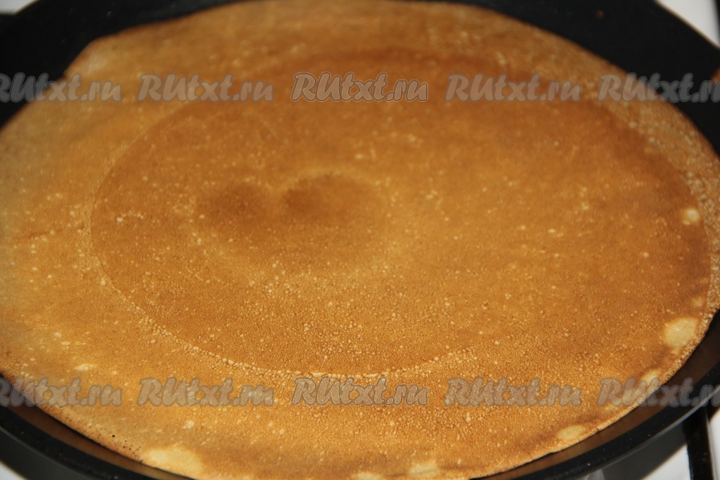 Раскалить сковороду, я смазала её растительным маслом только один раз перед первым блином, так как масло мы добавляем в само блинное тесто (при выпечке блинов масло в тесте не будет давать блинчикам прилипать к сковороде). Влить часть теста на сковороду и равномерно распределить. Жарить блин на среднем огне. Как только на поверхности блинчика появятся дырочки, перевернуть блин.