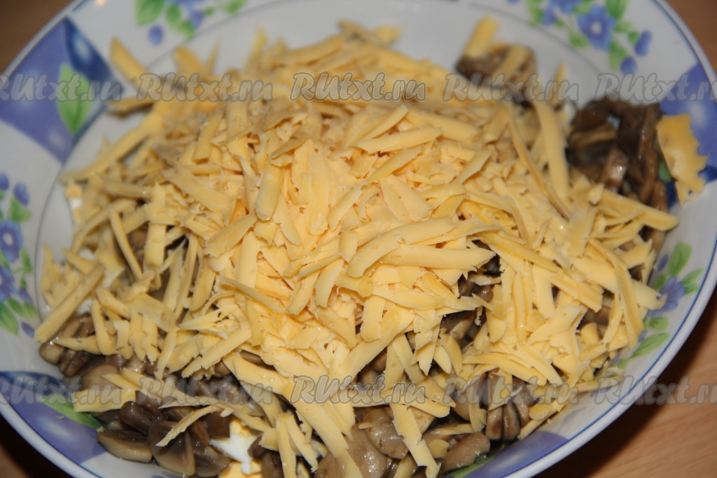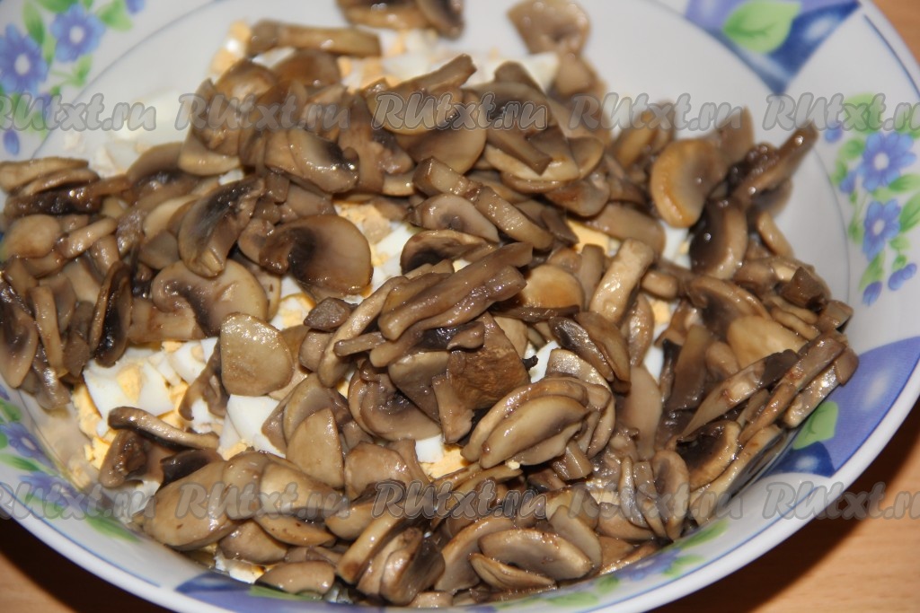 Добавить остывшие грибы в салат из яиц и куриной грудки.
