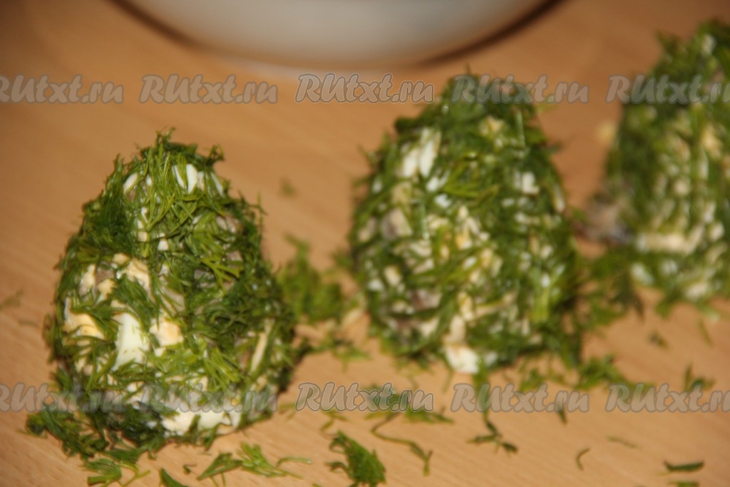 Из салатной массы сформировать небольшие конусы - они и станут нашими ёлочками.