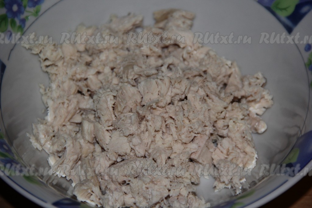 Куриную грудку предварительно сварить в подсоленной воде до готовности (варить минут 25-30 с начала закипания воды), а затем остудить в бульоне. Нарезать куриную грудку на мелкие кусочки.