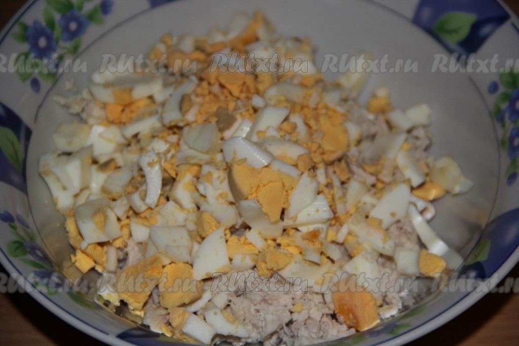 Яйца предварительно сварить в течение минут 10 с начала кипения воды, остудить и, очистив от скорлупы, нарезать мелко (или натереть на крупной тёрке). Соединить куриную грудку и яйца.