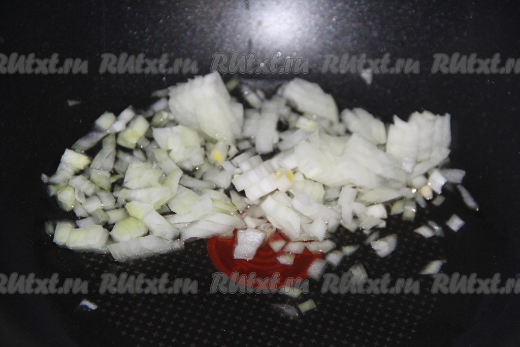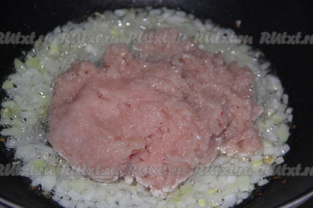 Обжарить лук, помешивая, в течение 3 минут на среднем огне. Затем добавить мясной фарш.