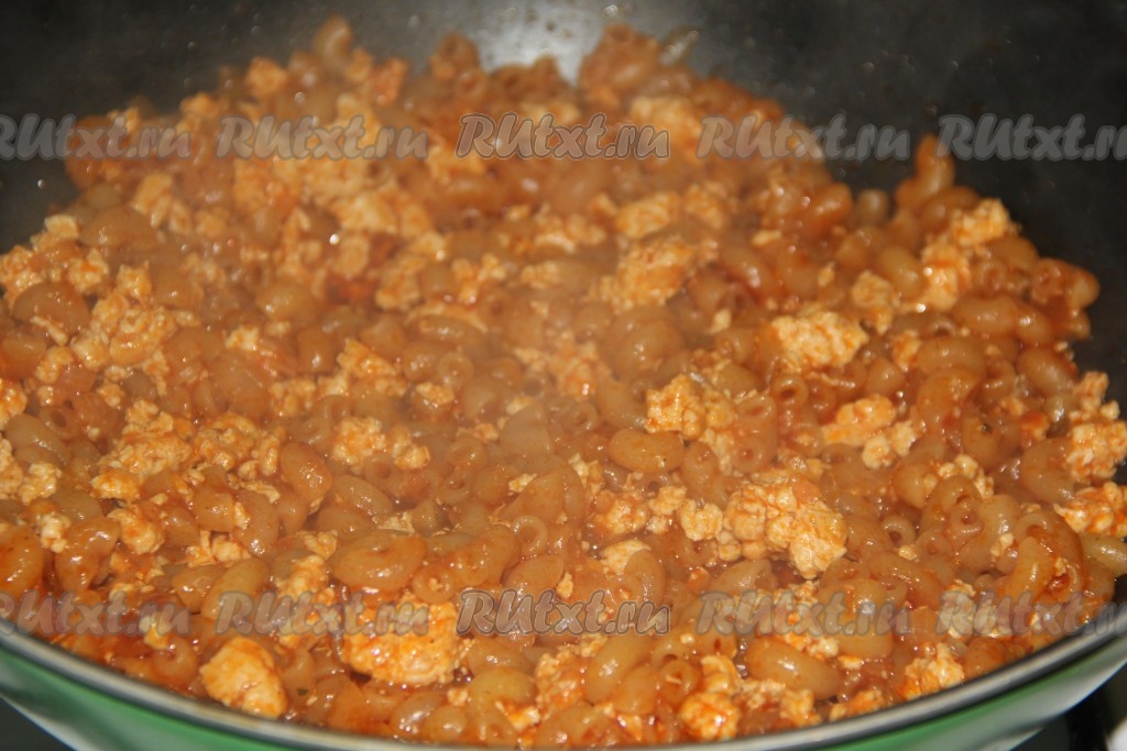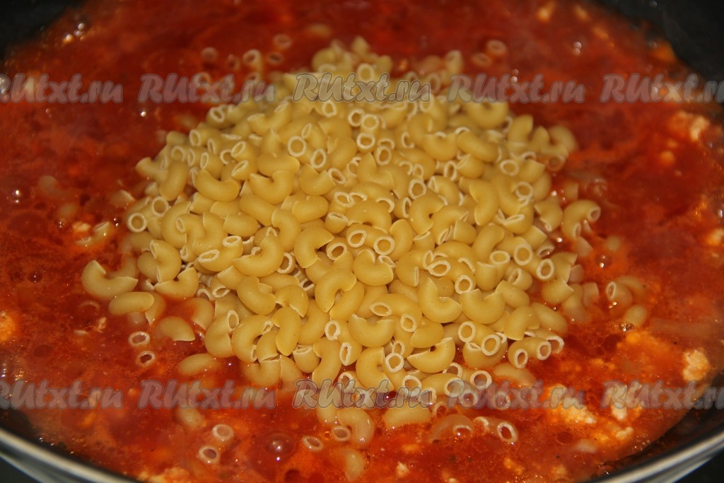 Всыпать макароны в сковороду, перемешать. Предварительно отваривать макароны не нужно.