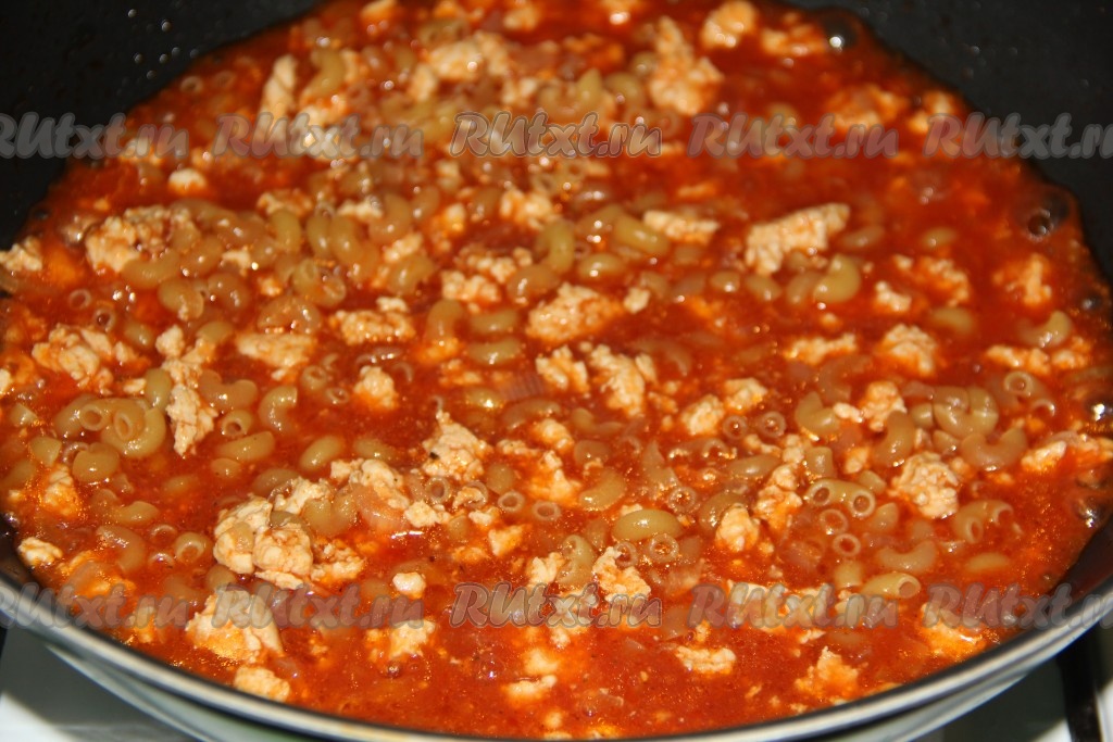 Перемешать макароны с фаршем и сыром, снять с огня.