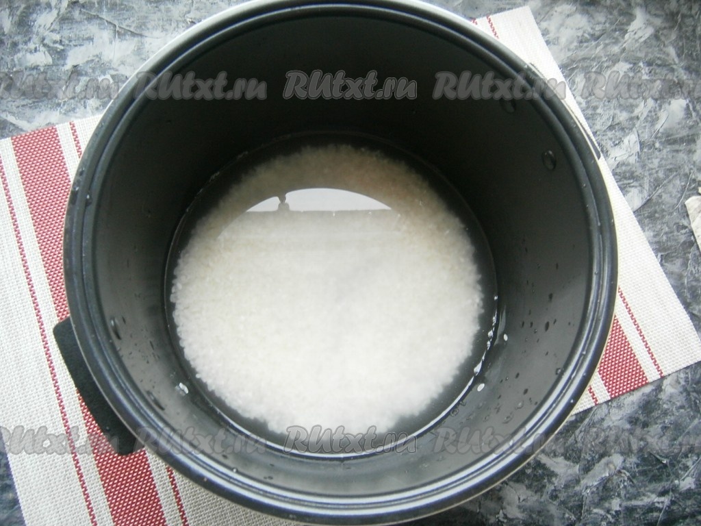 Самое главное - рис нужно очень хорошо промыть (то есть промыть 3-4 раза холодной водой, промывать нужно до тех пор, пока вода не станет прозрачной). Воду слить, рис высыпать в чашу мультиварки.