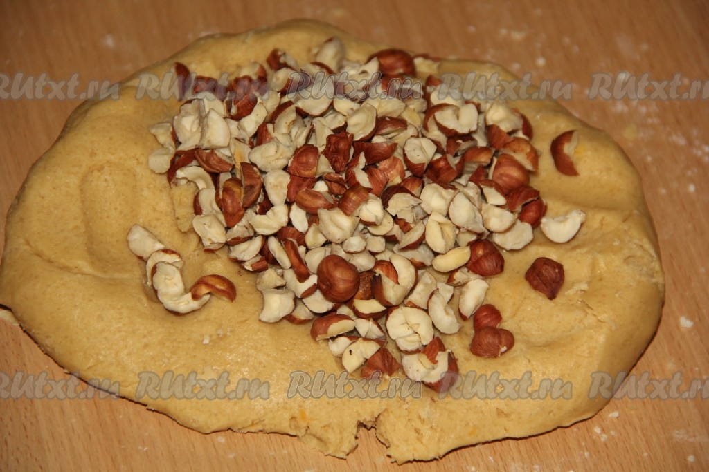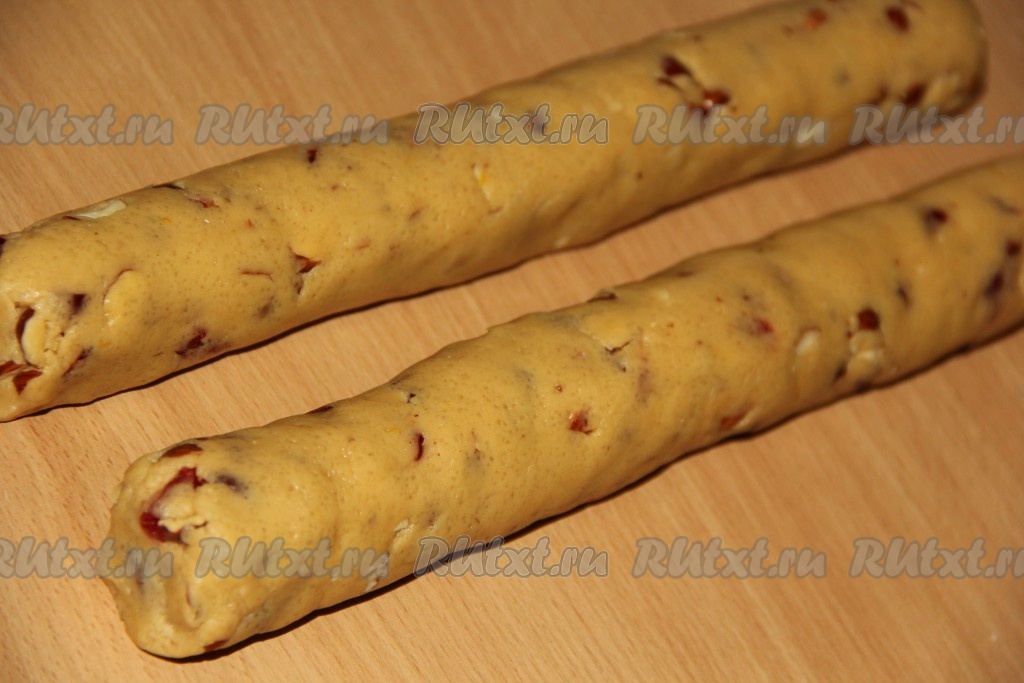Вмесить клюкву в тесто. Разделить тесто на две части, сформировать колбаски диаметром 3-4 сантиметра.