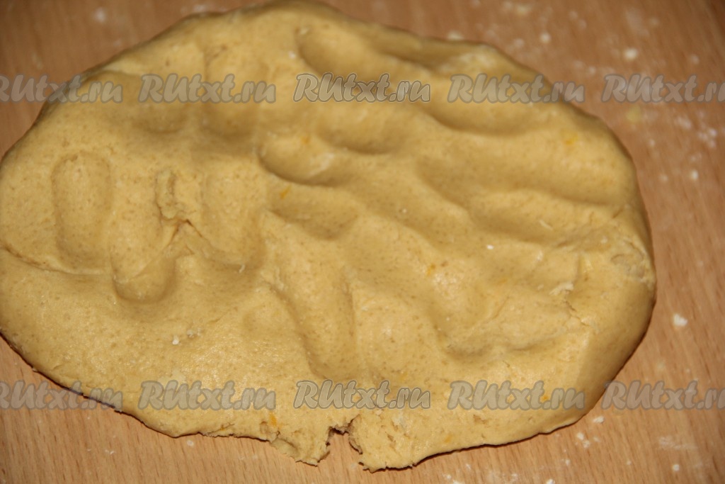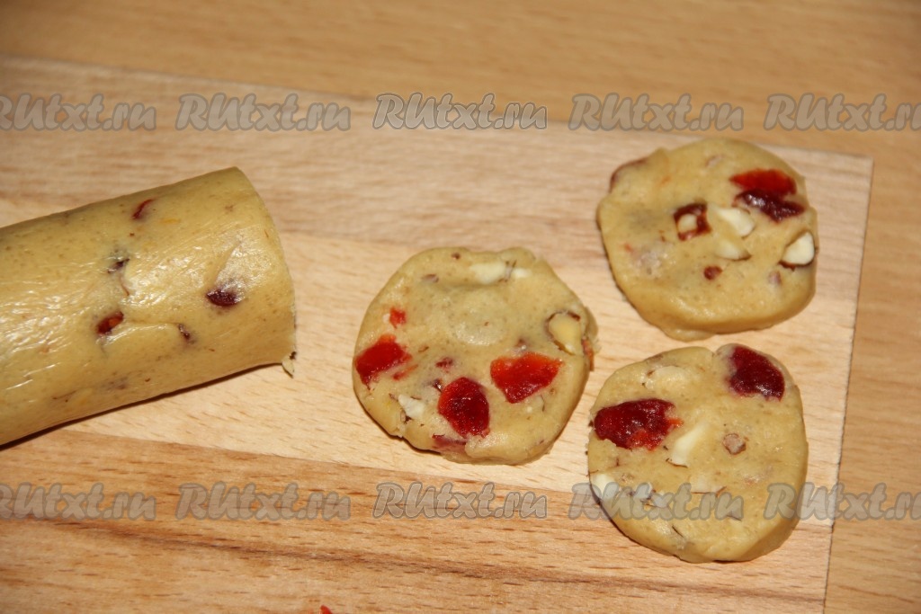 Затем освободить тесто от плёнки и нарезать каждую колбаску на шайбочки толщиной, примерно, 1,5-2 сантиметра.