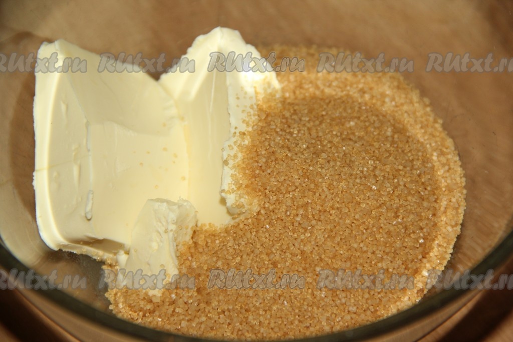 Для приготовления теста соединить размягчившееся сливочное масло и сахар (я использовала тростниковый сахар).