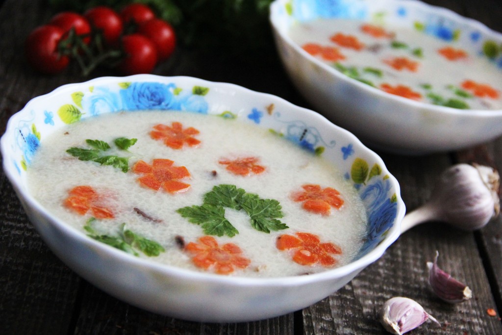 Чеснок мелко нарезать, а из вареной морковки вырезать цветочки.