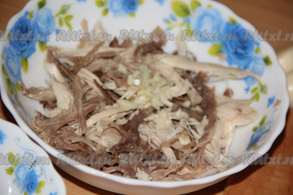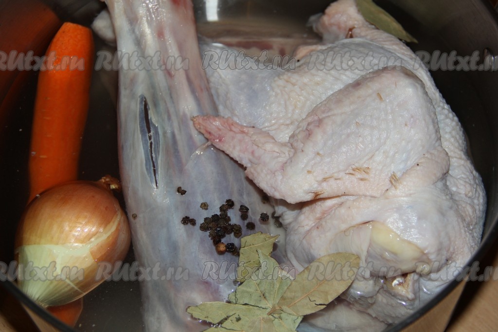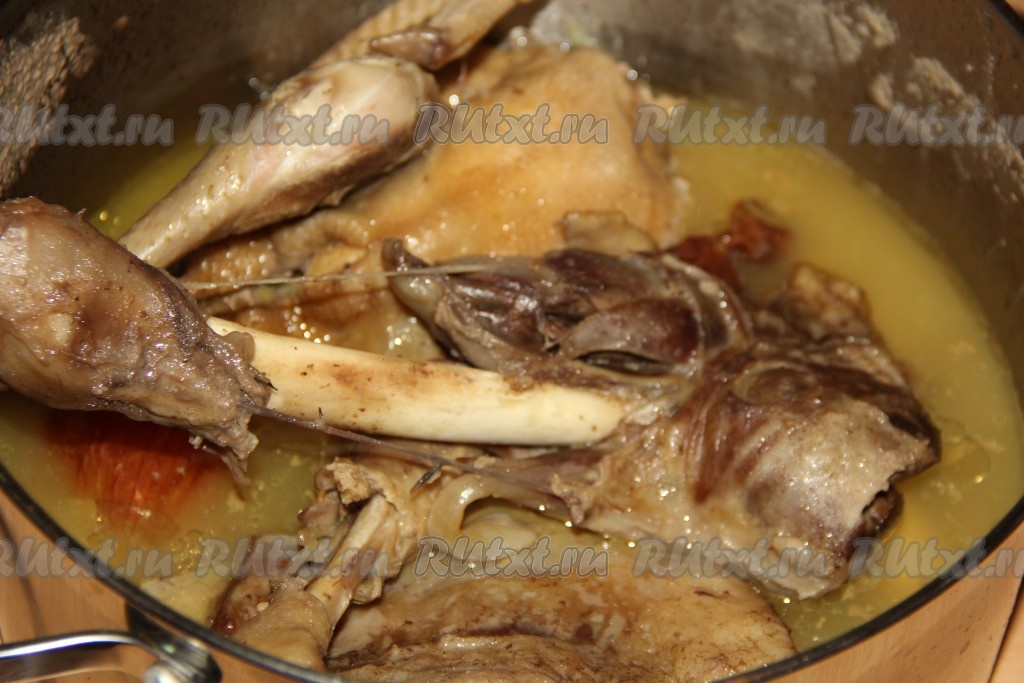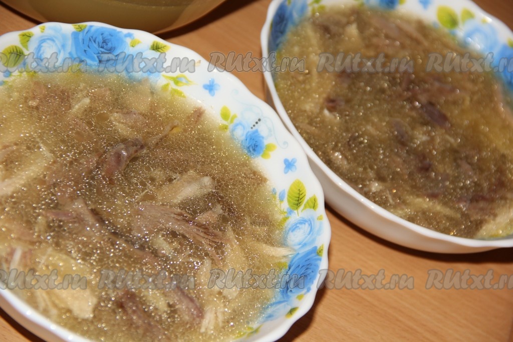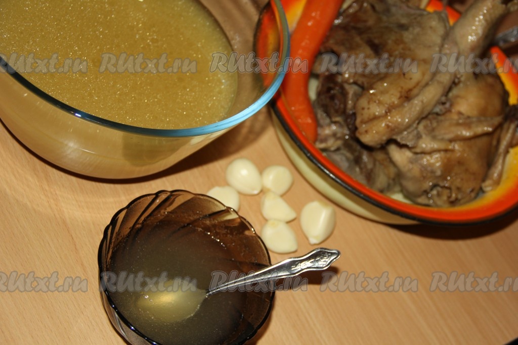 Снять кастрюлю с огня и оставить на 2-3 часа при комнатной температуре. Процедить бульон и посолить по вкусу. Отлить в отдельную миску 100 мл бульона. Когда бульон остынет, добавить желатин, перемешать и оставить набухать минут на 15. Чеснок очистить.