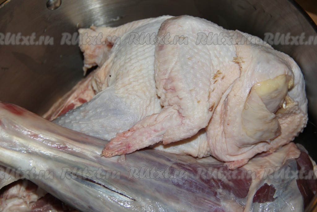 В кастрюлю с козлятиной добавить целую курицу (я её не разрезала на части).