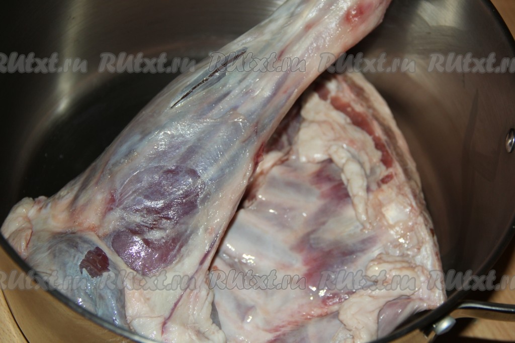 Козлятину и курицу вымыть. В кастрюлю выложить куски козлятины. Я варила холодец в кастрюле объёмом 7 литров.