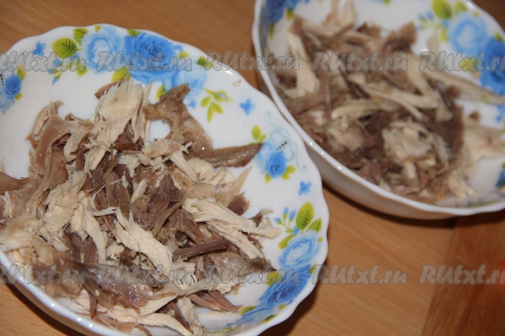 Мясо отделить от костей и порвать на волокна. Выложить мясо в тарелки (или формы для холодца).