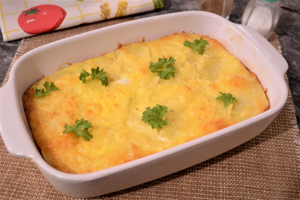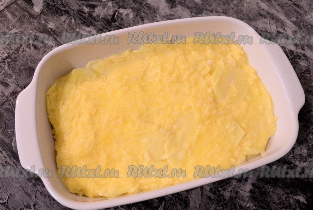 Форму для запекания (у меня размер формы 22х15 см) смазать растительным маслом, выложить картофель, разровнять его. Оставшийся натёртый сыр хорошо перемешать с ещё одним яйцом и равномерно залить этой смесью картофель сверху.