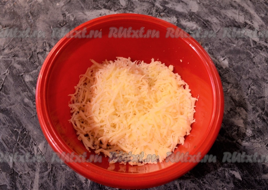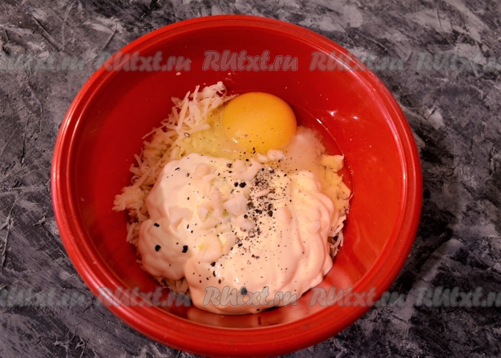 Половину сыра отложить в другую миску. В оставшийся сыр добавить 1 яйцо, майонез, измельчённый чеснок, соль и чёрный молотый перец по вкусу.