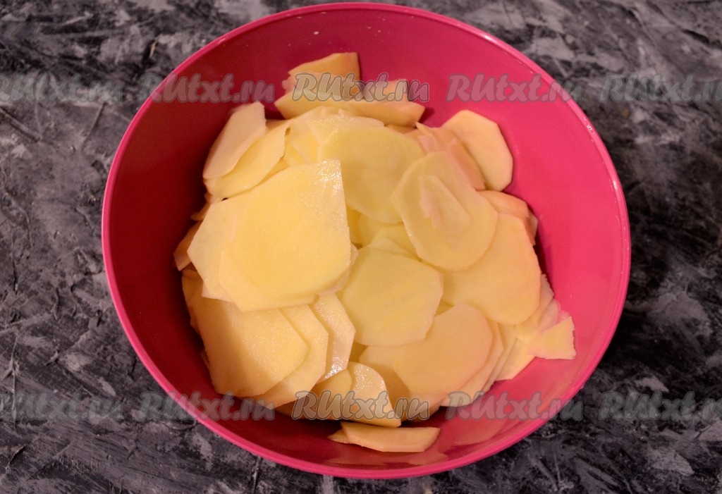 Картофель очистить и нарезать тонкими слайсами. Сделать это можно овощечисткой (или с помощью шинковки для капусты).