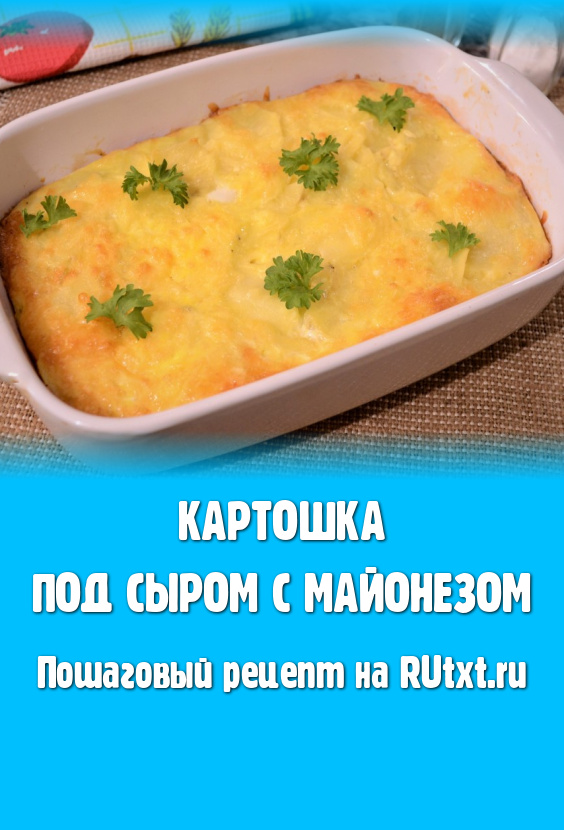 Духовку разогреть до 180 градусов, запекать картошку под сыром с майонезом около 35-45 минут (до румяной корочки сверху и готовности картофеля). Это вкусное, нежное, сытное блюдо нужно подавать к столу в горячем виде, украсив зеленью и нарезав на части.