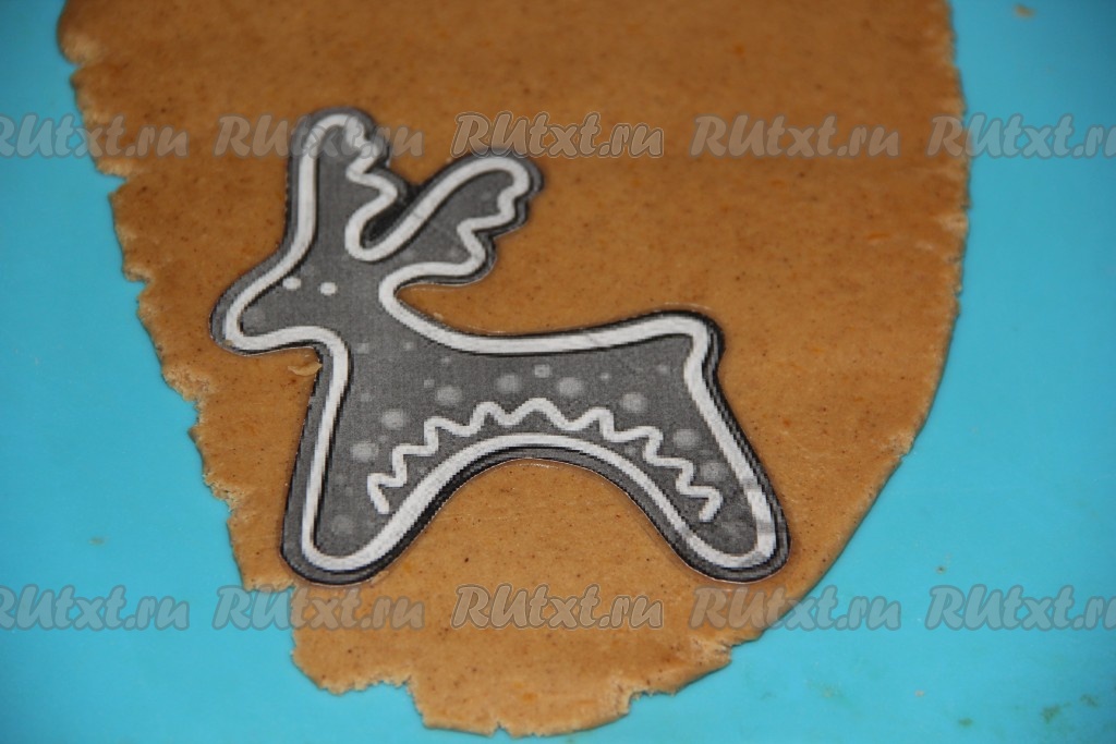 Готовое тесто разделить на несколько частей, пока с одной частью работаем, оставшееся тесто пусть лежит в холодильнике. Одну часть теста скалкой раскатать в пласт толщиной 5-7 мм и вырезать пряники, используя трафарет (или вырубки для пряников).