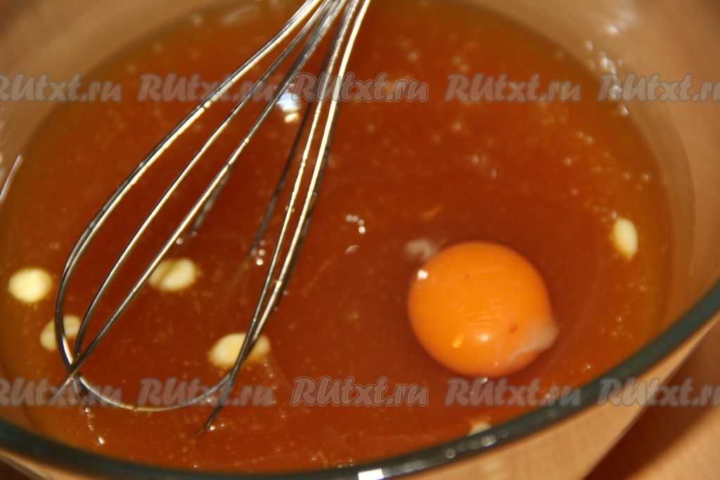 Массу перемешать венчиком до однородности, перелить в миску для замешивания теста, дать немного остыть. В остывшую массу добавить вначале одно яйцо, перемешать, а затем - второе яйцо и ещё раз перемешать.
