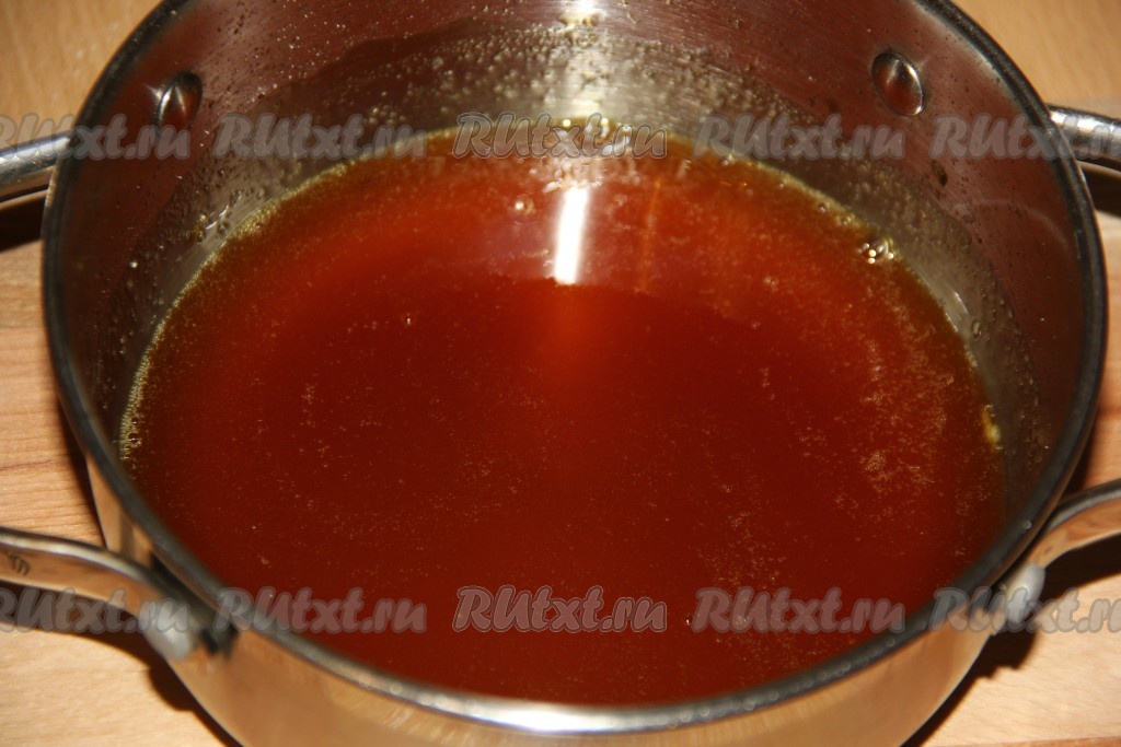 Жжёный сахар должен стать красивого коричнево-красного цвета. Когда жжёнка приобретёт нужный цвет, влить в неё небольшими порциями, перемешивая, 100 мл крутого кипятка и на небольшом огне, помешивая, довести до кипения. Затем всыпать 150 грамм сахарной пудры и лимонную кислоту на кончике ножа.