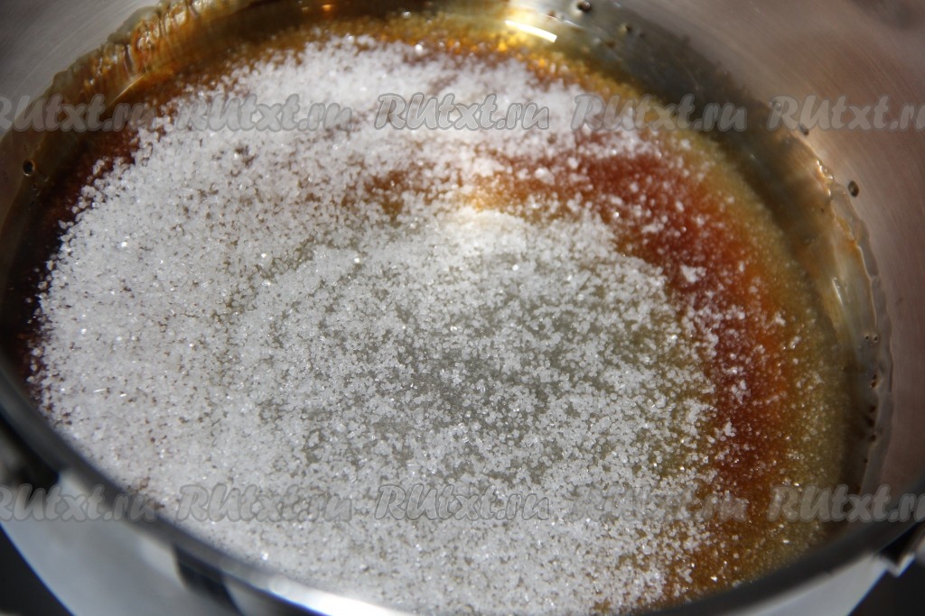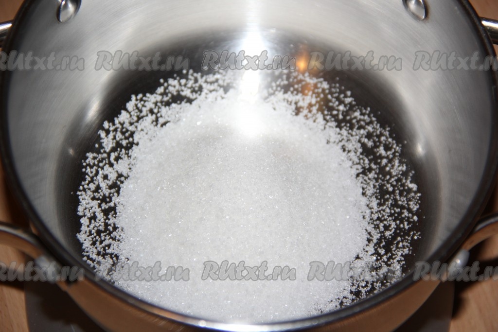 Из холодильника достать 100 грамм сливочного масла, дать полежать при комнатной температуре, чтобы масло стало мягким. На дно сотейника (или сковороды с толстым дном) всыпать 50 грамм сахара.