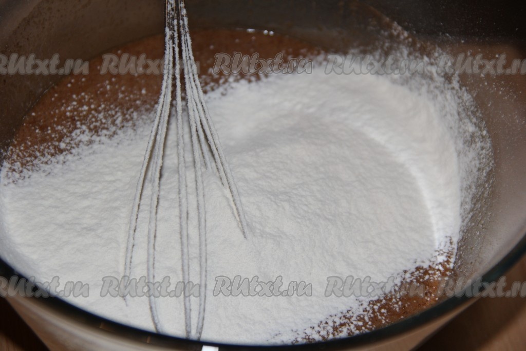 Добавить соду и всыпать постепенно просеянную муку, перемешивая тесто вначале ложкой (или лопаткой), а затем, переложив его на присыпанный мукой стол, вымесить руками.