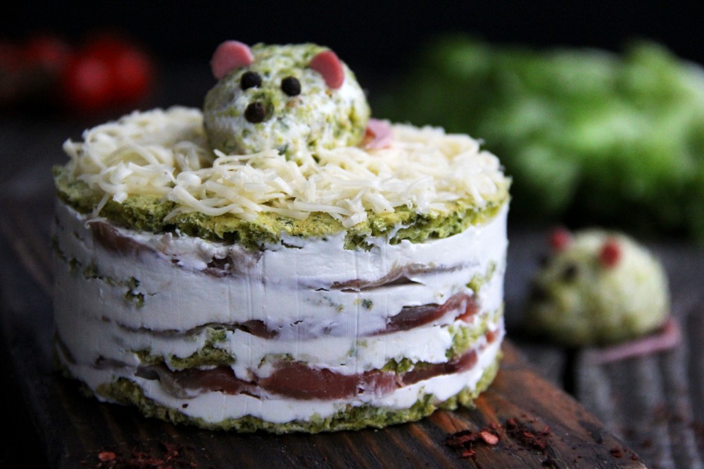 Верх торта можно посыпать натёртым твёрдым сыром или смазать творожным сыром. Я из остатков коржа сделала мышек для украшения, для этого нужно раскрошить корж, добавить немного творожного сыра и из получившейся массы сформировать мышек, глазки и носик можно сделать из горошин чёрного перца, а ушки и хвостик - из кусочка колбасы. Оставить торт для пропитки на пару часов в холодильнике. Вот такой красивый и очень вкусный закусочный торт, приготовленный с красной рыбой и творожным сыром, получился.
