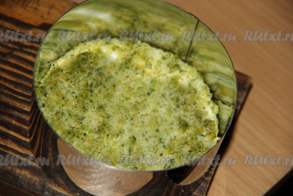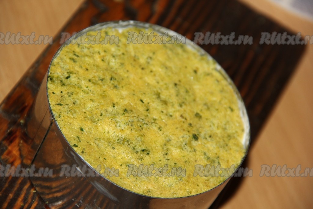 Слегка смазать красную рыбу творожным сыром и выложить следующий корж. Таким образом собрать весь закусочный торт. Верхний слой - корж. Бортики аккуратно убрать.