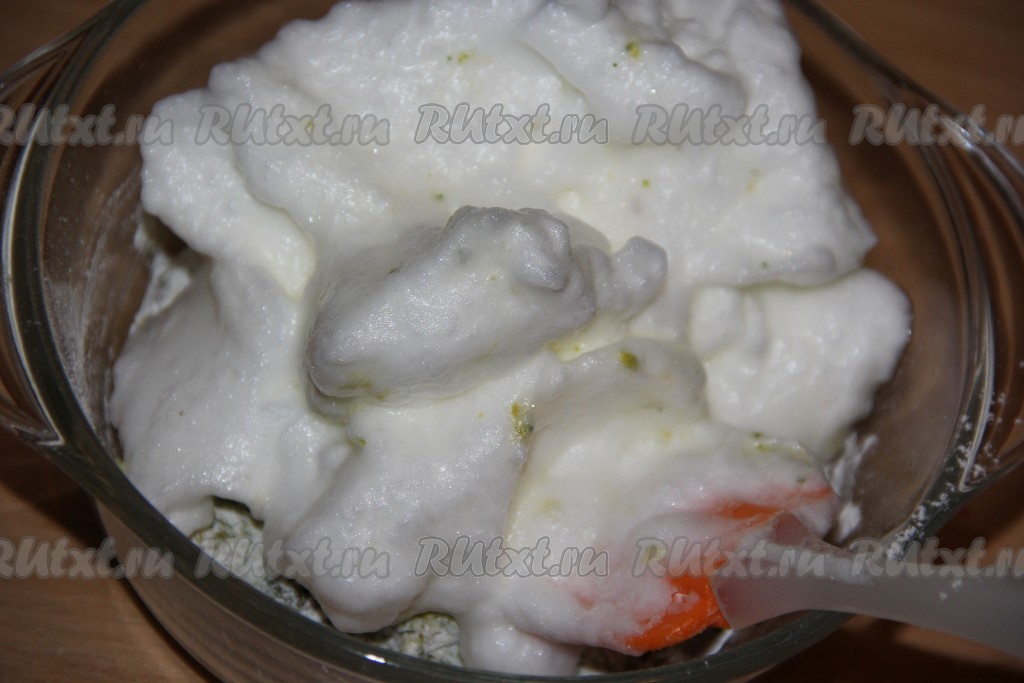 Аккуратно подмешать белки в тесто с помощью лопатки. Тесто получится воздушным.