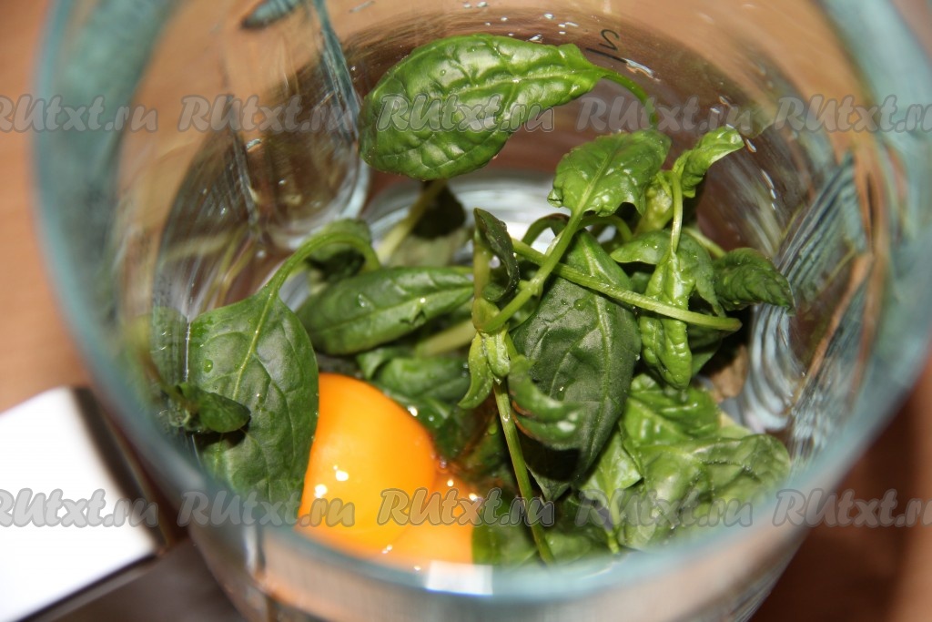 Разделить яйца на желтки и белки. Шпинат (или другую зелень) промыть под водой и выложить в чашу блендера. Добавить яичные желтки. Пробить массу погружным блендером в пюре.
