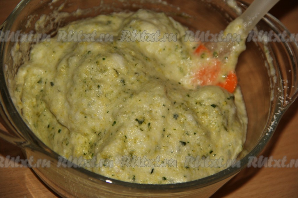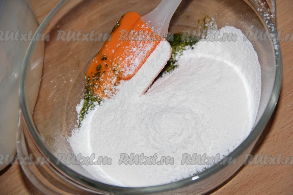 Выложить зелёную массу в миску, добавить просеянную муку, соль и соду, перемешать тесто лопаткой.