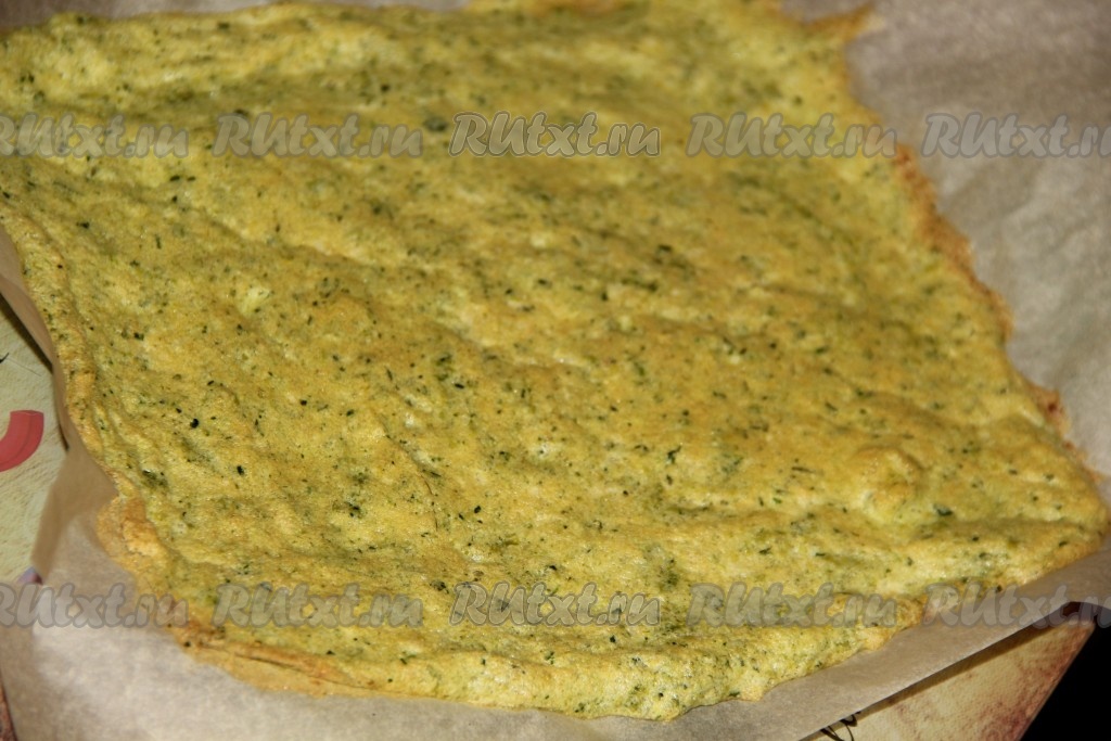 Готовый корж достать из духовки, дать немного остыть, затем перевернуть и снять пергамент. Коржу дать полностью остыть.
