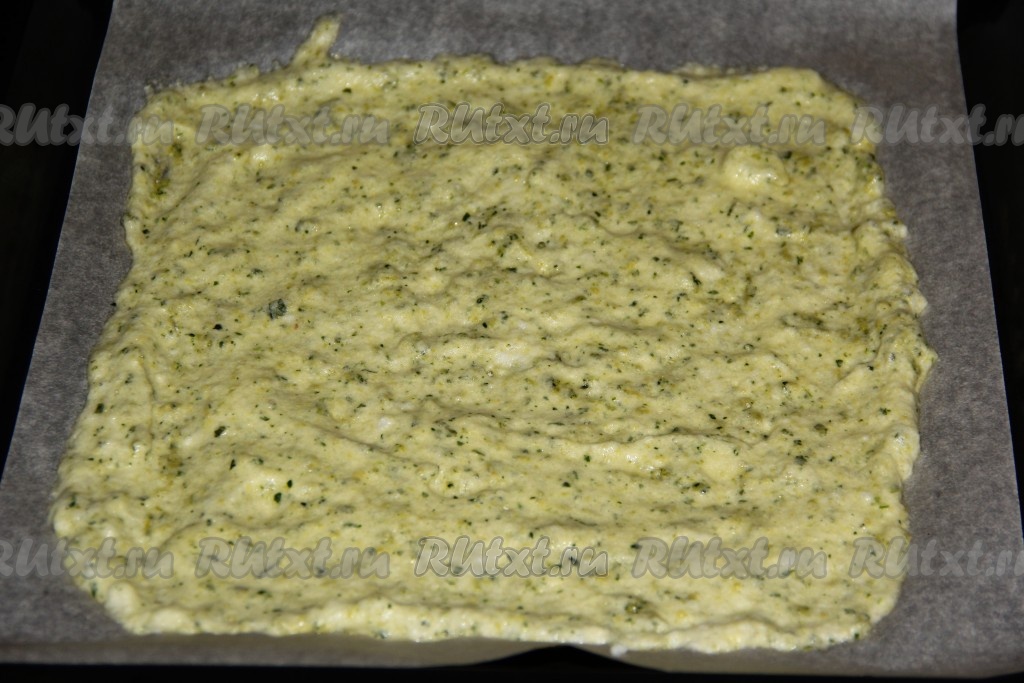 Противень застелить пергаментом и слегка смазать растительным маслом. Выложить массу и разровнять. У меня размер противня 30х28 см, тесто заняло не весь противень.