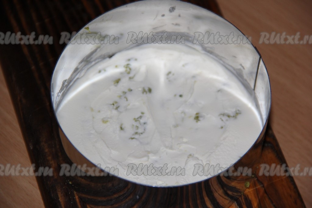 Смазать корж творожным сыром.