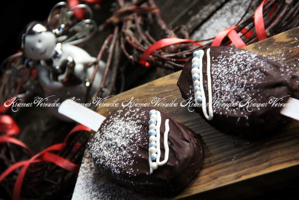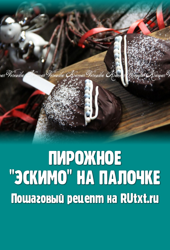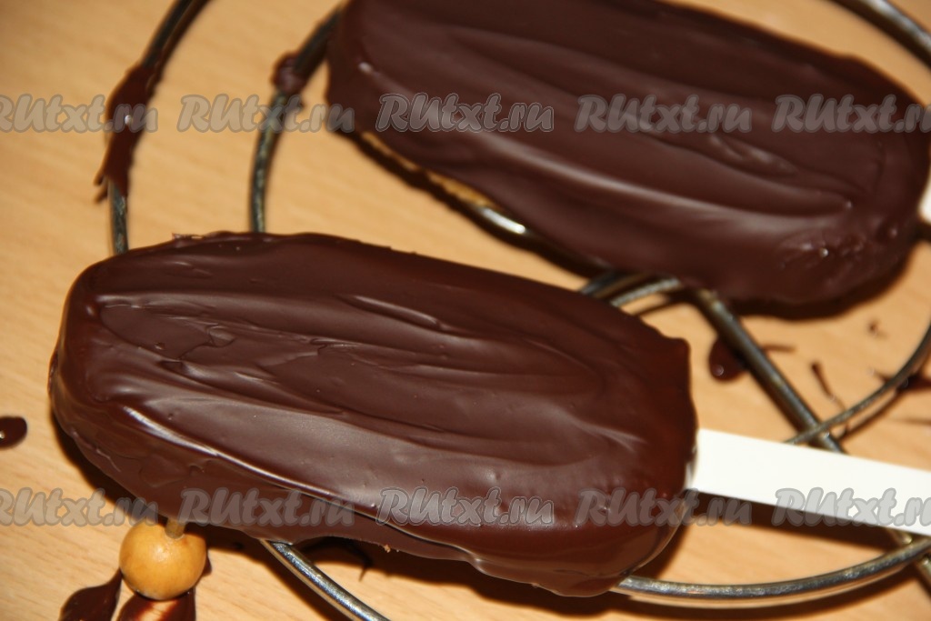 Вставить палочки в эскимо и покрыть пирожное растопленным шоколадом. Так как пирожное холодное, шоколад быстро схватывается. Оставить пирожные на столе или убрать в холодильник на 15 минут, чтобы шоколад полностью застыл.