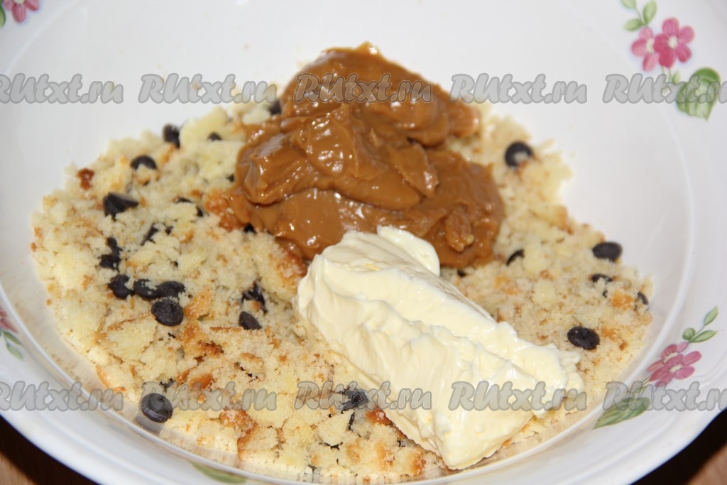 Сливочное масло заранее достать из холодильника, чтобы оно полежало некоторое время при комнатной температуре и стало мягким. Бисквит или кексы раскрошить в мелкую крошку. Можно взять даже покупной бисквит или покупные кексики. Порой остаются обрезки от коржей, они тоже прекрасно подойдут для этого рецепта. А можно испечь специально бисквит или кексы для этого десерта (отлично подойдут вот такие кексы).