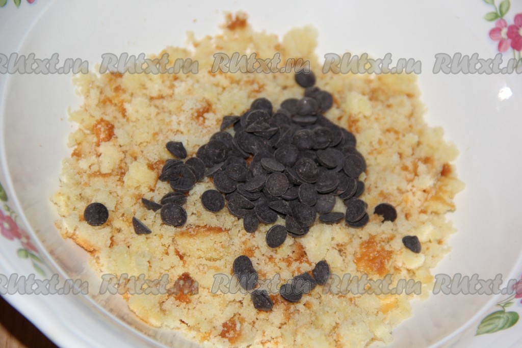 К бисквитным крошкам добавить шоколадные капли. Если нет капель, то можно натереть на тёрке (или порубить ножом) половинку плитки шоколада.