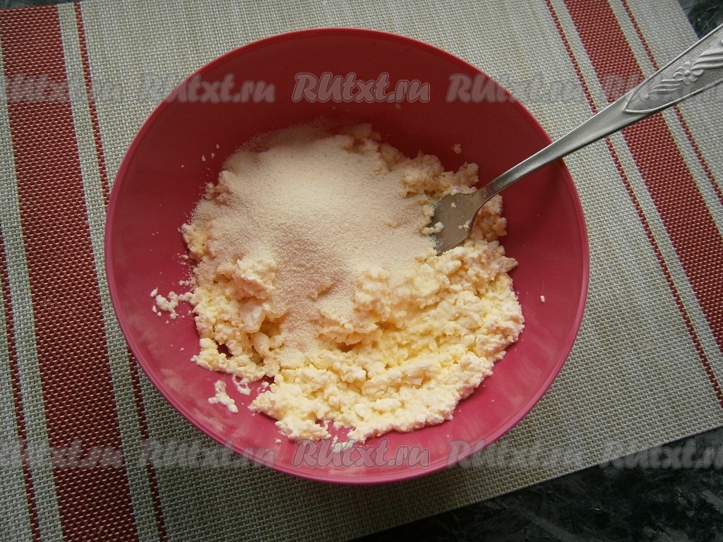 Тщательно растереть вилкой, чтобы не было больших крупинок, затем всыпать манную крупу.