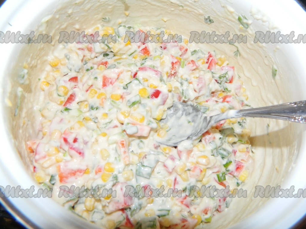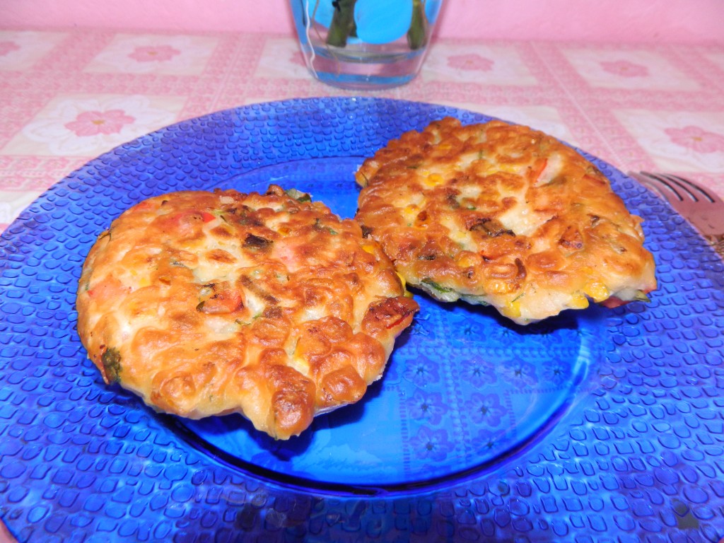 Формируем небольшие кукурузные оладьи. Жарим на сковороде с разогретым растительном масле с обеих сторон до образования золотистой корочки.