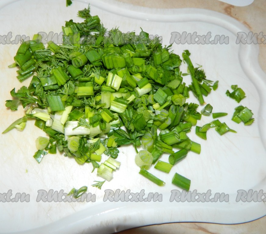 Добавляем зелень, молоко, муку с разрыхлителем и соль. Нужное количество муки можно отмерить, насыпав муку в уже опустевшую банку от кукурузы. Все хорошо перемешиваем.