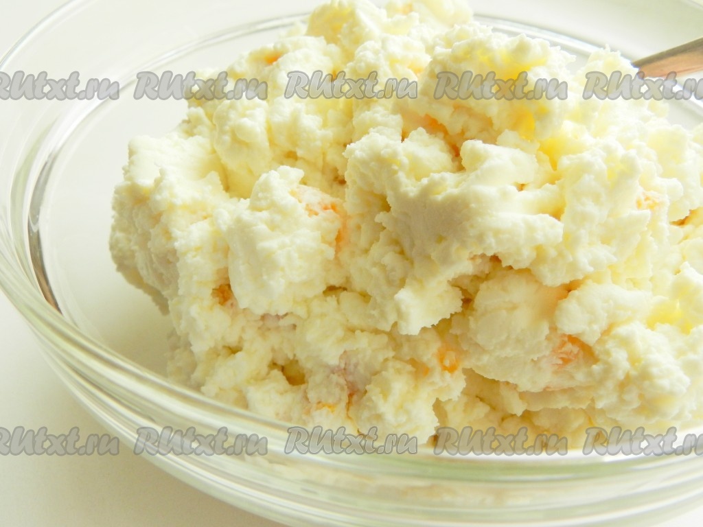 Приготовить начинку. Для этого творог растереть с яйцом, сахаром и ванильным сахаром, добавить нарезанную курагу, перемешать.