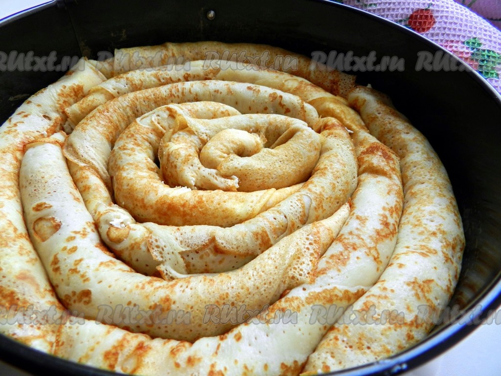 Форму для выпечки смазать маслом. Блины с начинкой выкладывать в форму по спирали.