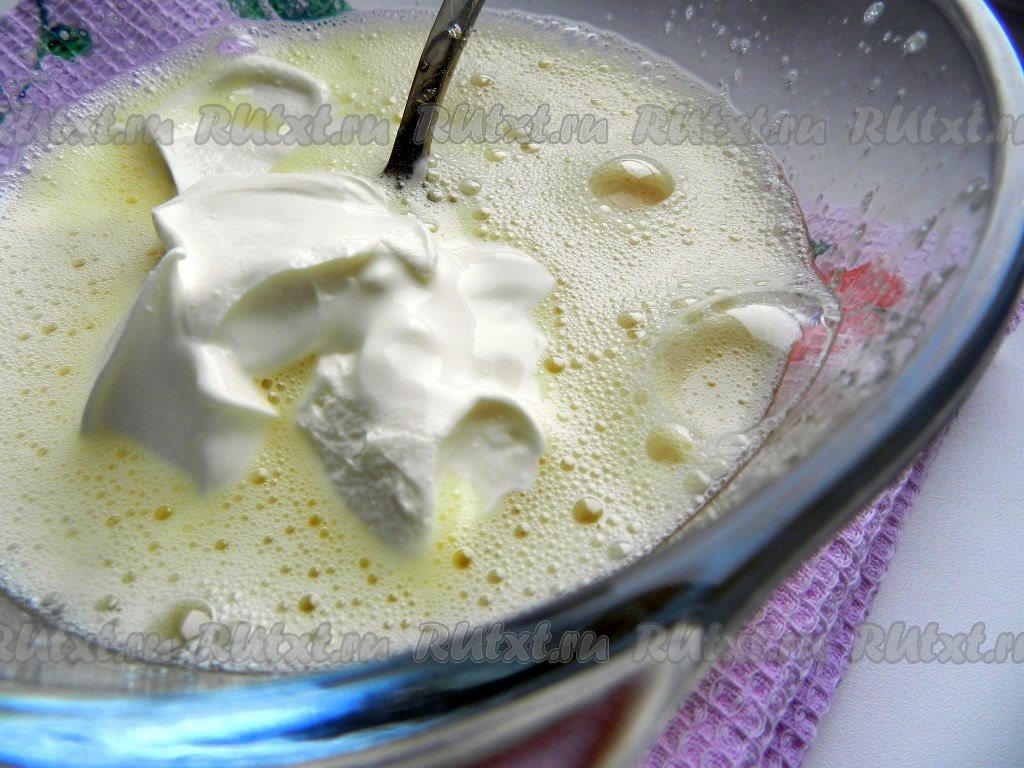Приготовить заливку для блинного пирога. Для этого яйца слегка взбить с сахаром, добавить сметану, перемешать до однородной массы.