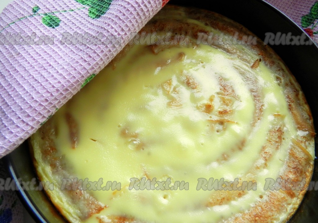 Весь блинный пирог равномерно покрыть заливкой, поставить форму с пирогом в разогретую до 190 градусов духовку на 30-35 минут.