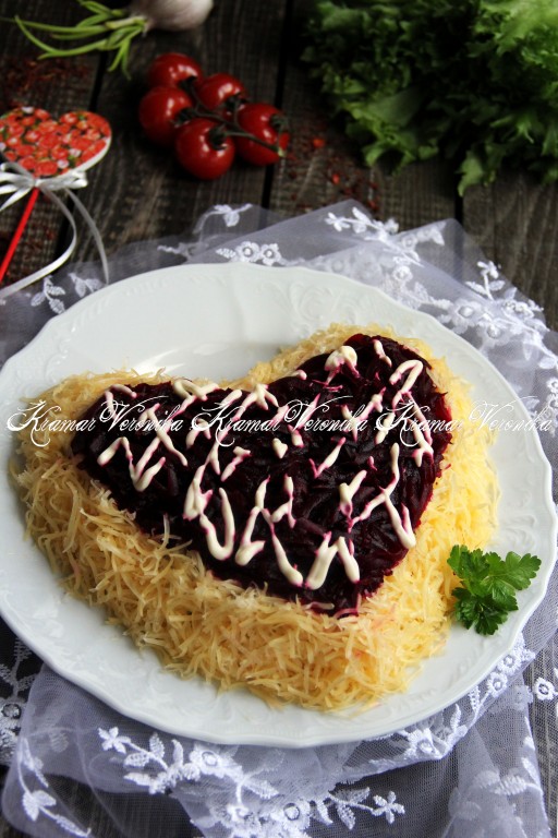 Сочетание в салатах свеклы и куриного мяса встречается достаточно часто. Предлагаю ещё один очень удачный рецепт нежного, вкусного и достаточно сытного салата из свеклы, курицы и солёных огурцов. Готовится он из вполне доступных продуктов. Формируется слоями. Я приготовила его на праздничный стол, сформировав в виде сердца. Блюдо получилось эффектным. Такой салат, приготовленный ко Дню всех влюблённых или к 8 Марта, станет вашим признанием в любви близким. Всем советую приготовить вкусный, аппетитный слоёный салат по этому рецепту!