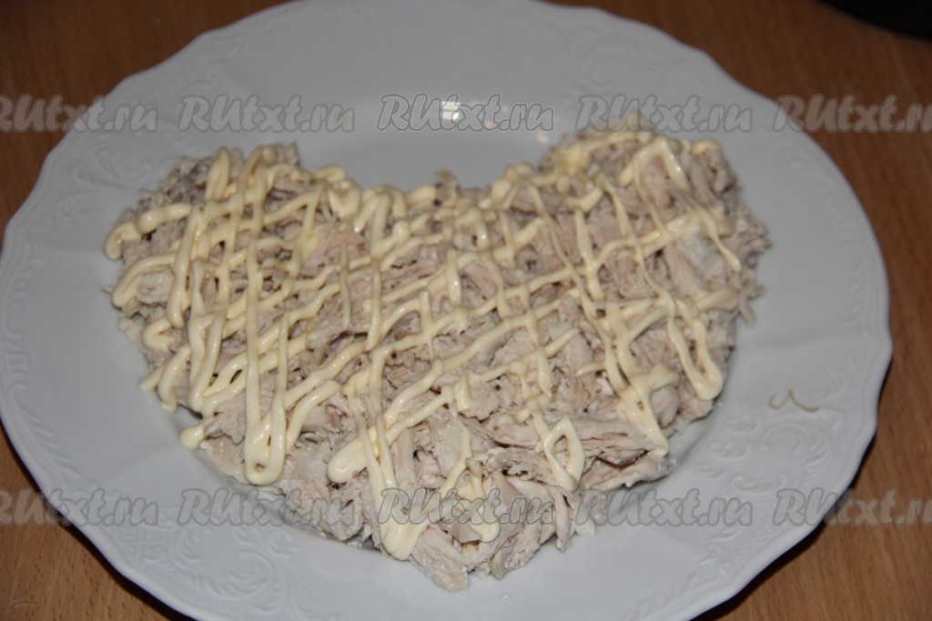На плоскую тарелку выложить куриное мясо в виде сердца.