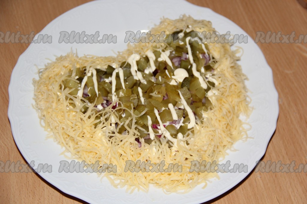 Нанести сетку из майонеза поверх огурцов и на бока салата. Сыр натереть на мелкой тёрке и выложить высокий бортик салата (как на фото).