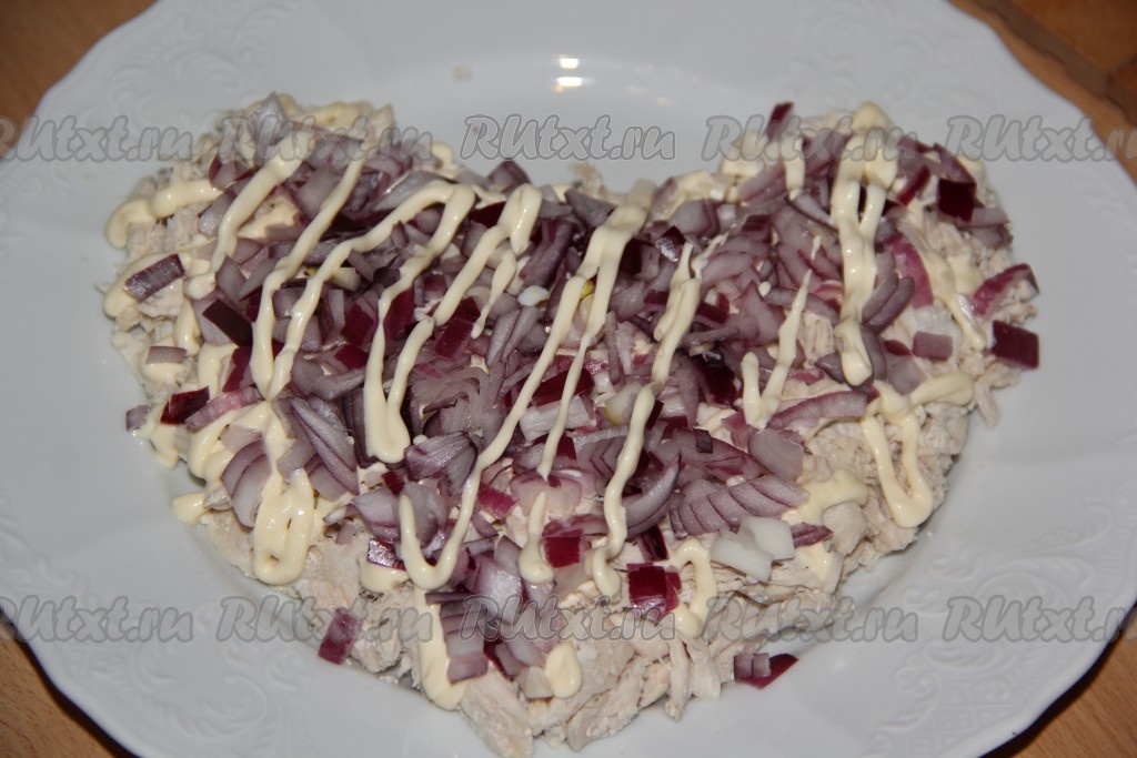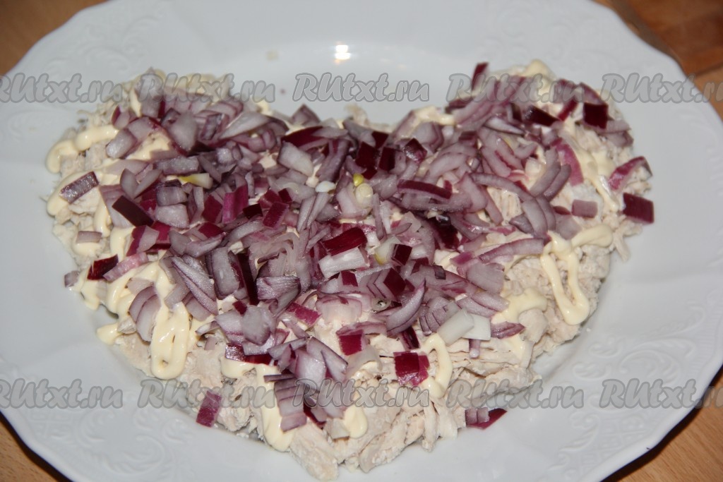 Лук очистить, нарезать на тонкие полоски. Я готовила салат с красным луком, он не горчит, если же вы готовите с обычным репчатым луком, тогда нарезанный лук выложите в дуршлаг, обдайте кипятком, дайте воде стечь и оставьте на пару минут, чтобы лук остыл. Поверх куриного филе равномерно выложить лук.