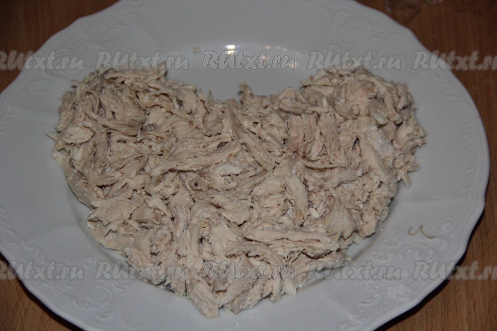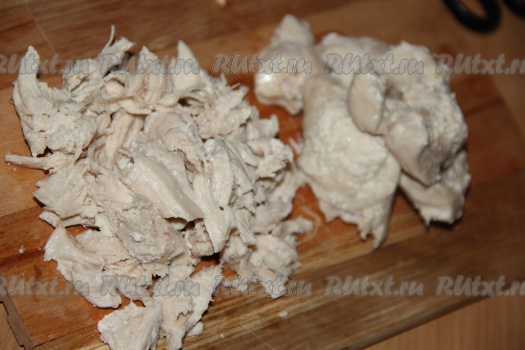 Заранее отварить свеклу до готовности (в течение минут 50 с начала кипения воды), затем остудить и очистить от кожуры. Куриное филе предварительно отварить в течение минут 25-30 (до готовности) в подсоленной воде, а затем снять с огня и дать остыть в бульоне. Нарезать остывшее мясо на небольшие кусочки (или нарвать на волокна).